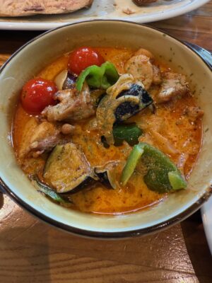 カレーの辛さと、パンケーキの甘みが、程よく交差する。