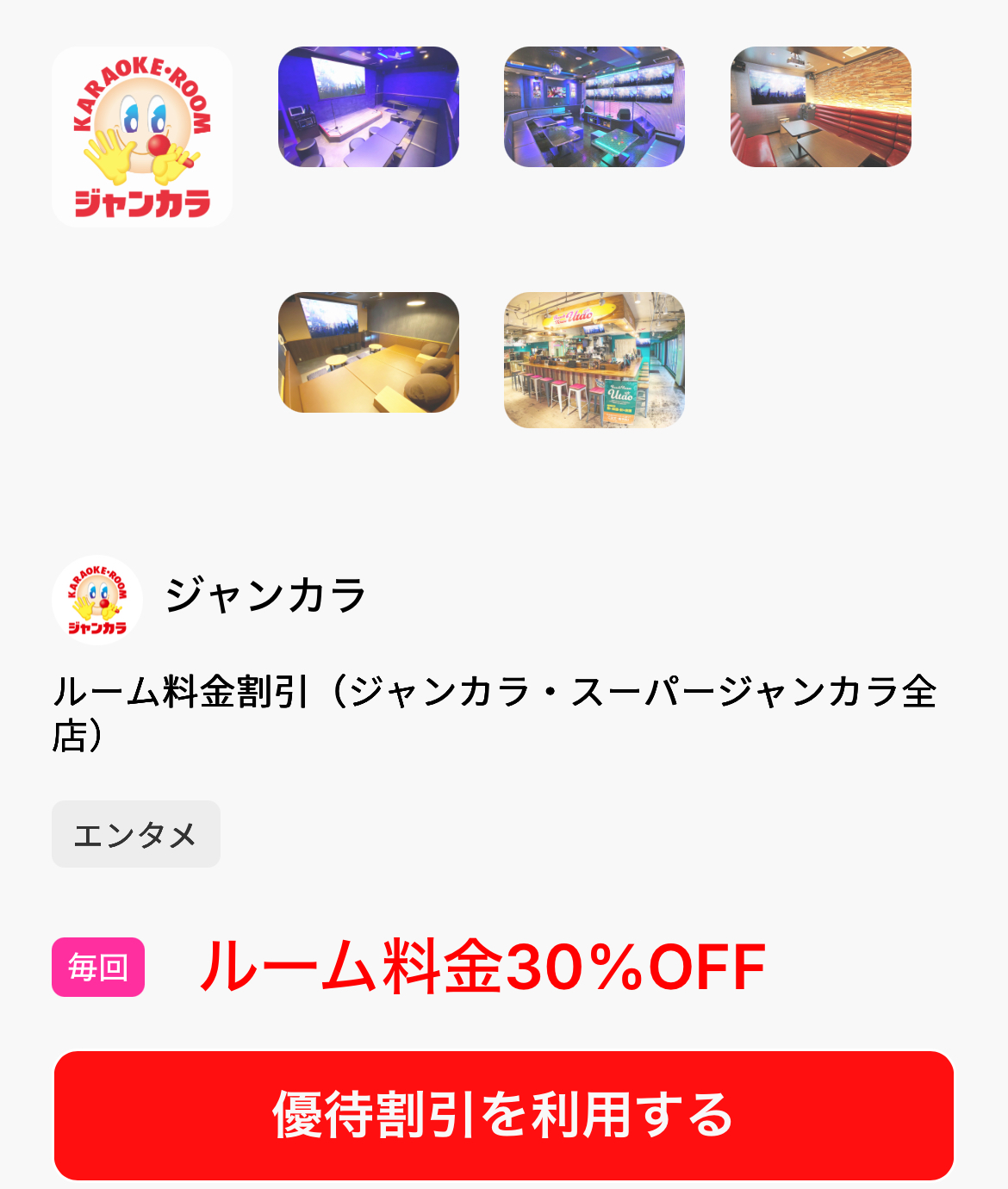 またカラオケでも、ルーム料金30%オフで、得した気分。知る知らないで大きく変わる。