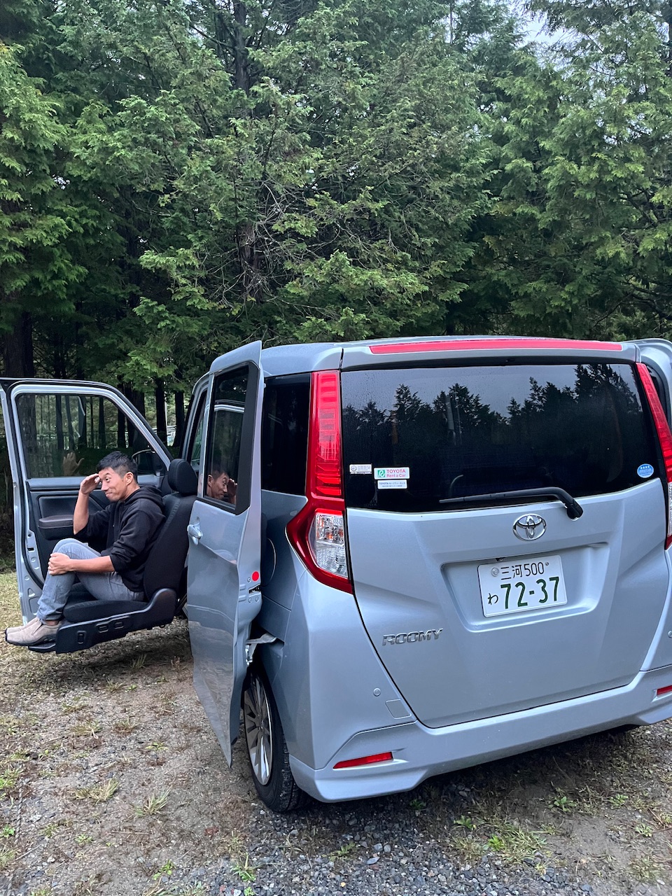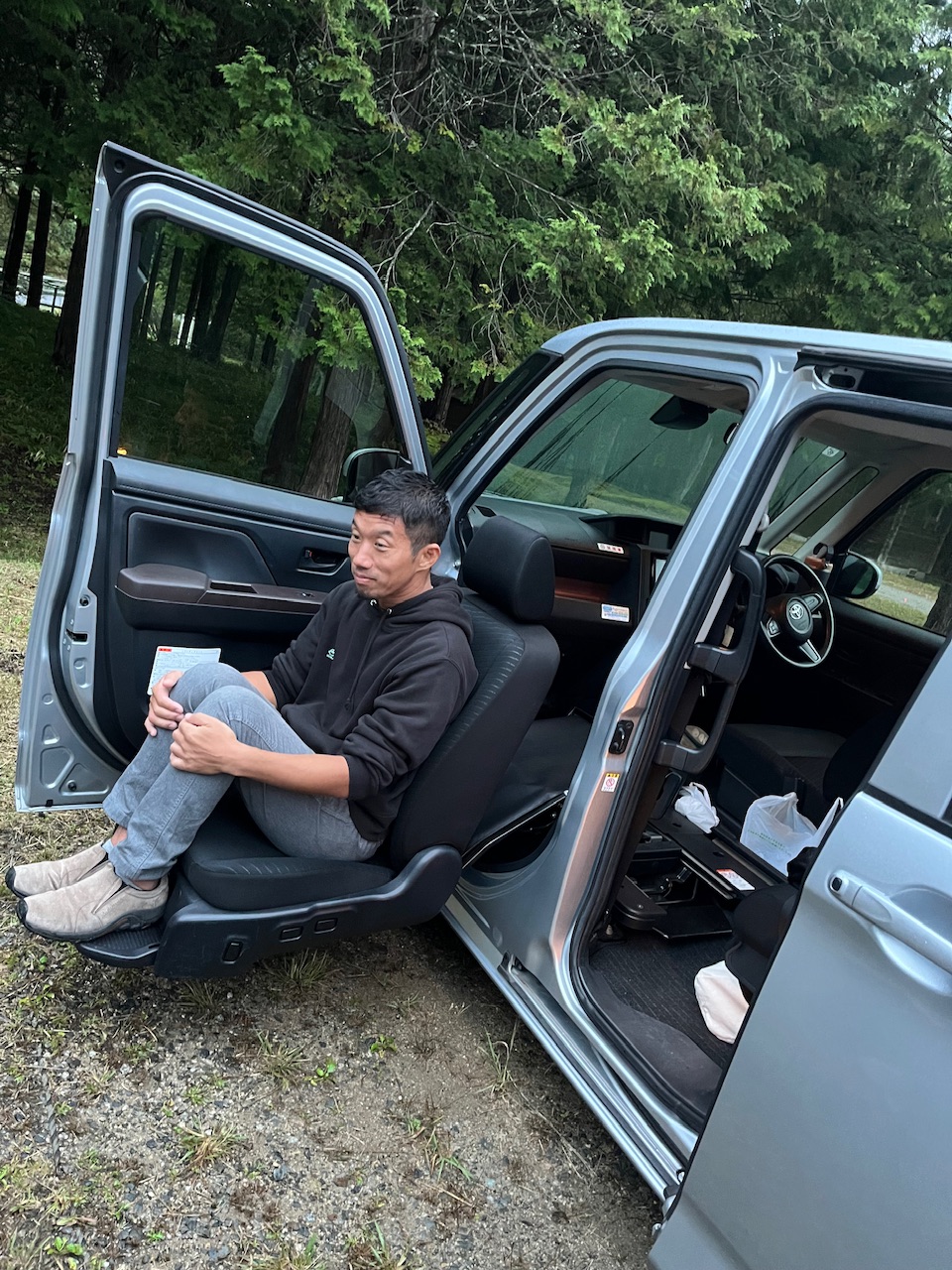 トヨタのROOMY。長距離には、車椅子の座席よりも、車のクッションのが全く乗り心地が別物だと言う。