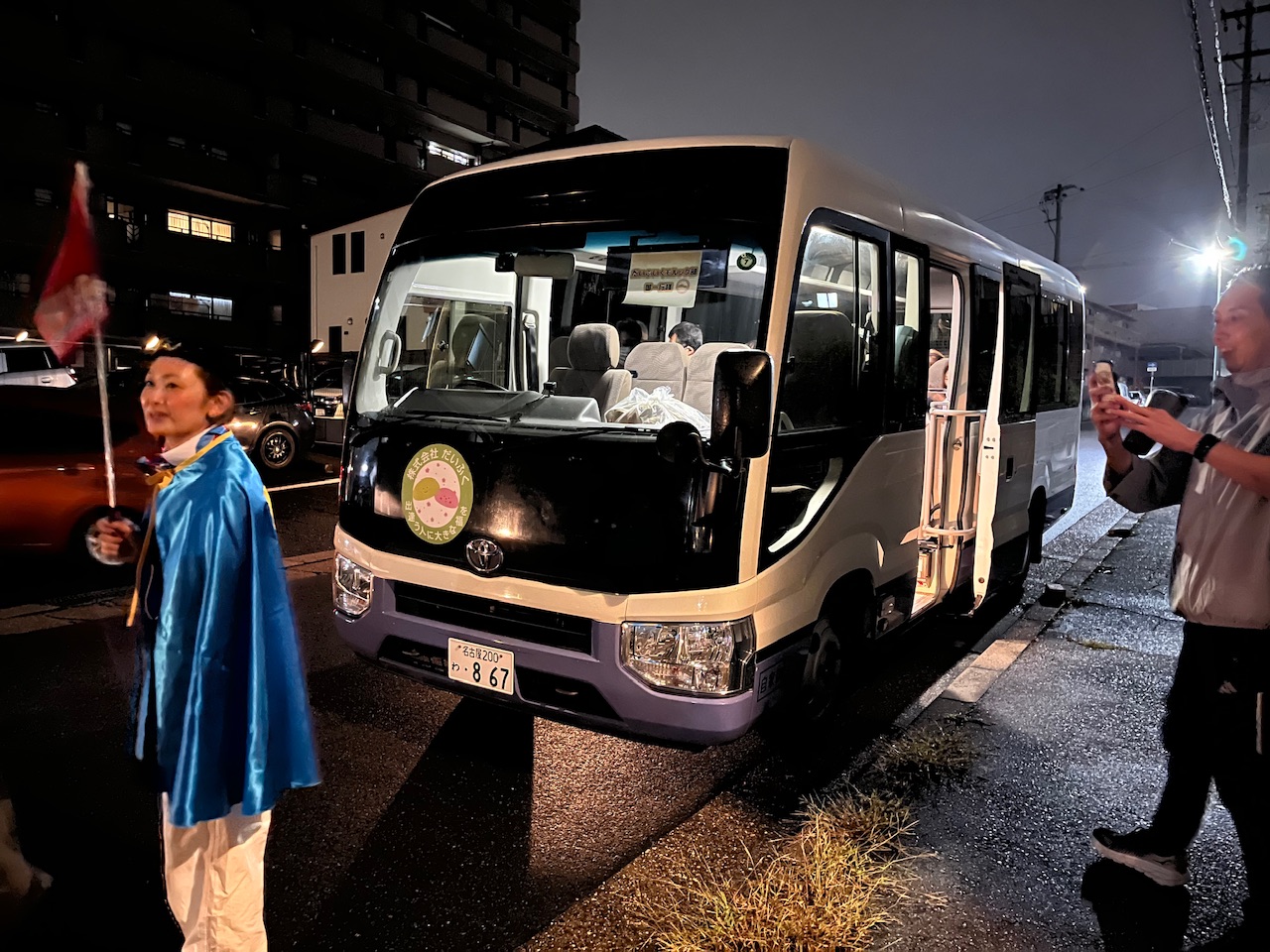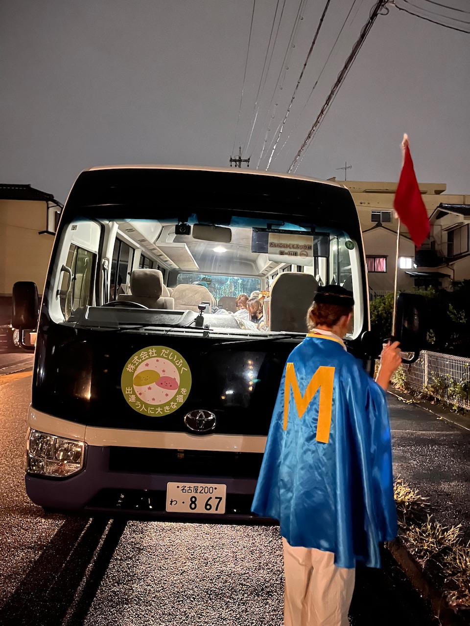 宇宙からやってきたモルックマンや、愛知メンバーをマイクロバスに乗せて、いざ決戦の地、千葉県へ。