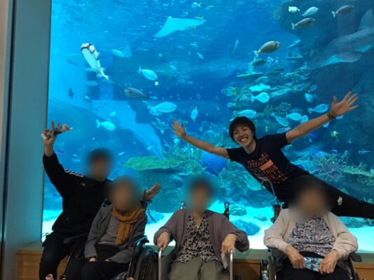 職場の旅行で利用者さんたちと撮った写真。