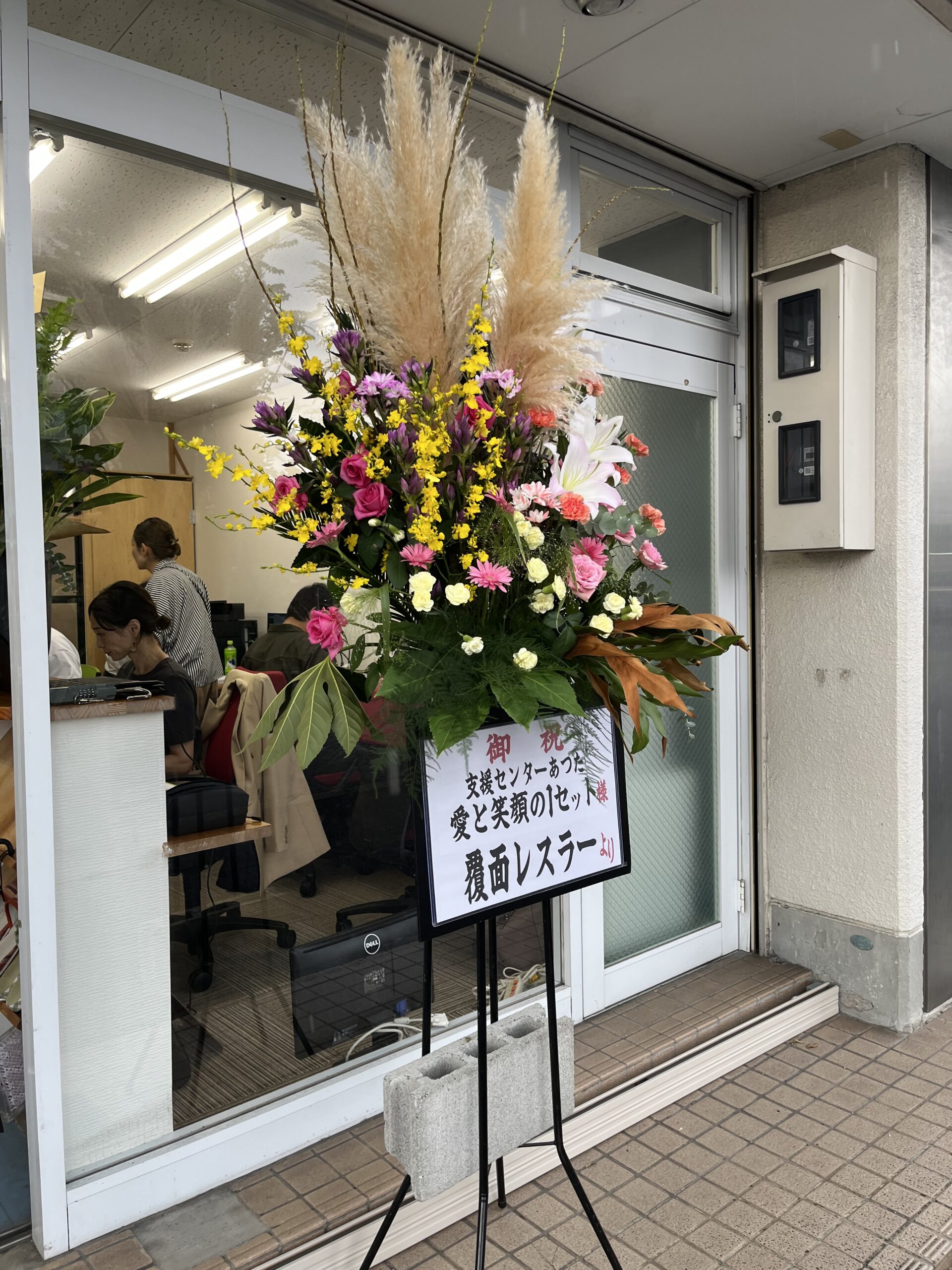 あつたオープンの時に贈って下さった、入り口右のお花の贈り主さまの、覆面レスラーと言う文字で、通る方に言われた言葉🤭