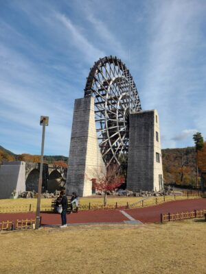 おばあちゃん市山岡には日本最大級の水車があります!水車の下に入って濡れてきました!