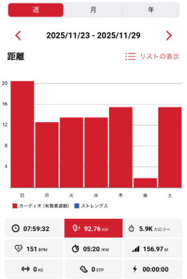 ・土曜日→15㎞jog(5′10″-5′00″) 左臀部違和感の為、ペース上げず様子見。