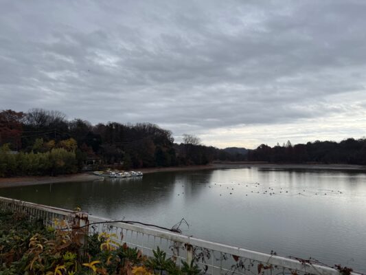 池を見ながら。思い出し笑い。