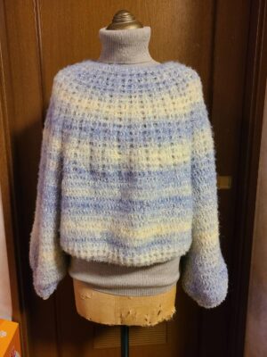 続いて、ファンシーヤーンを編むことと、引き揃えで編むことをやってみたくて、下の水色のセーターを編んでみました。